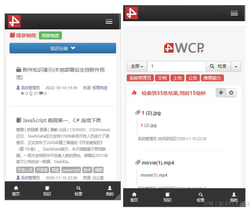 Wcp知识库中的检索为全文检索,既检索范围包括知识标题、标签、正文、作者、分类、附件内容等。同时还支持在结果中进行二次检索或者限定结果知识类型(知识、附件)。