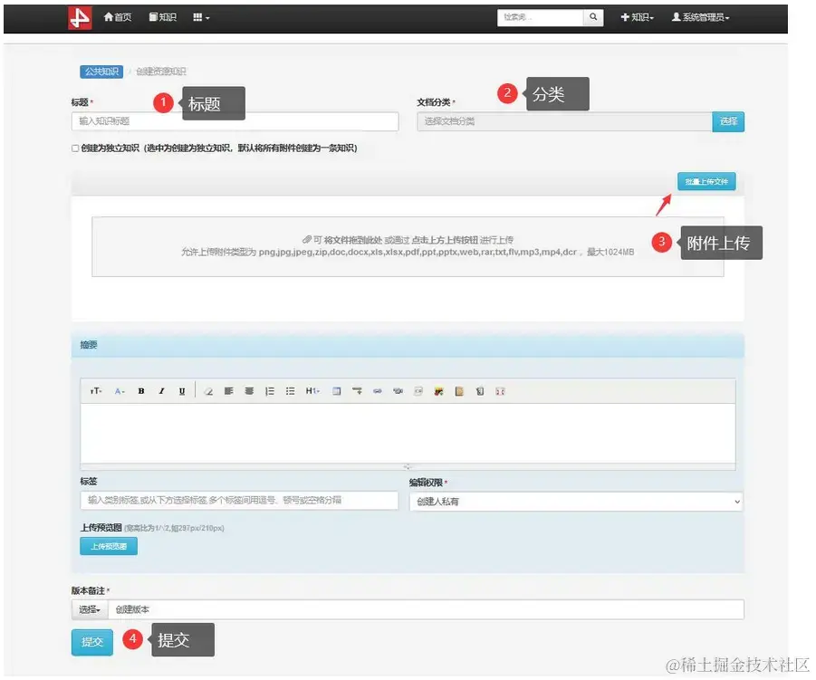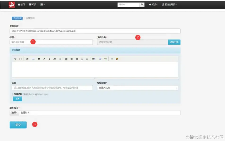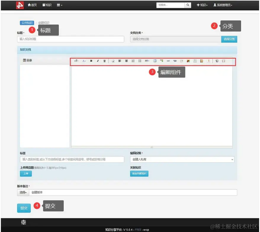 如上图:在前台页面,点击右上角创建知识按钮,可进行知识创建。