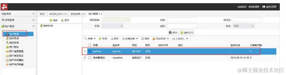 operatorLoginname operatorPassword 接口用户:在用户管理中查看用户类型为接口的用户,如下图