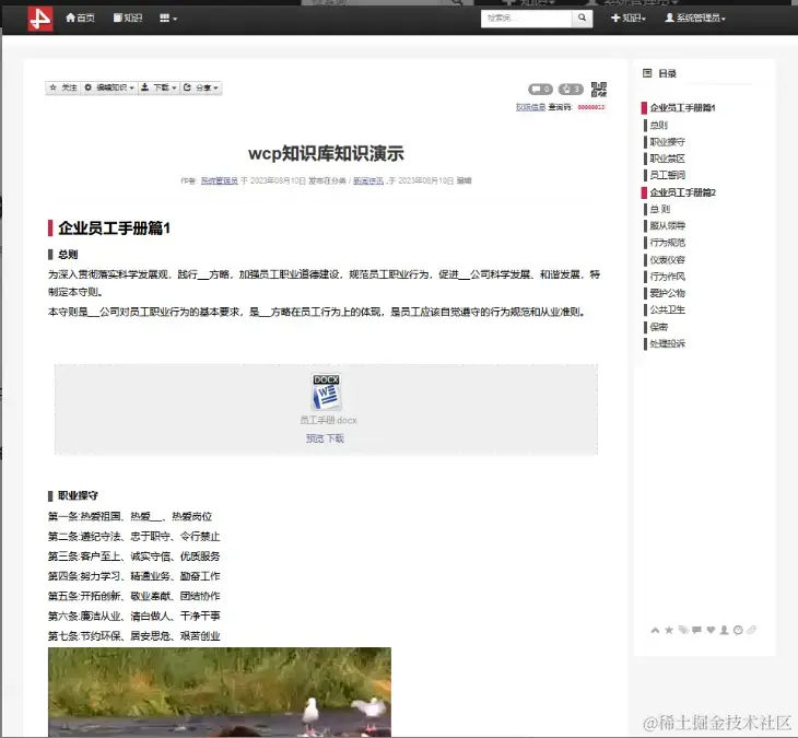 文档知识,如下图通过超文本创建的知识,可以在編輯知识的过程中为知识添加图片、视频、附件等内容元素,该类型的知识支持在线編輯。或通过word文件创建,或通过部分网页下载生成。