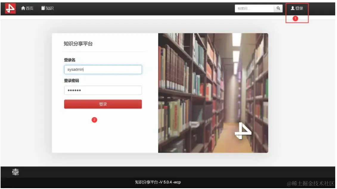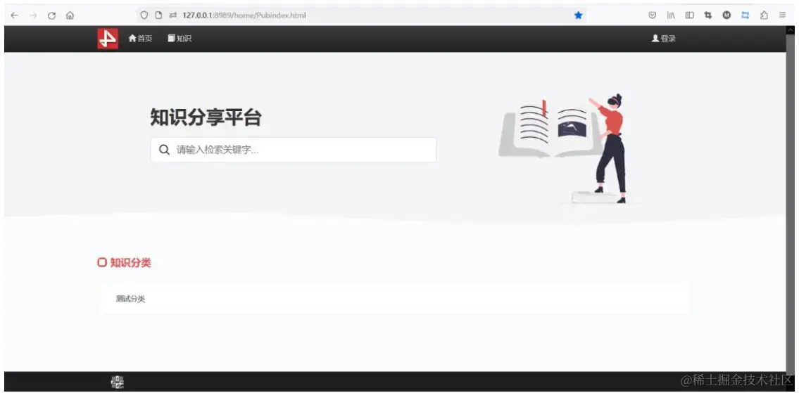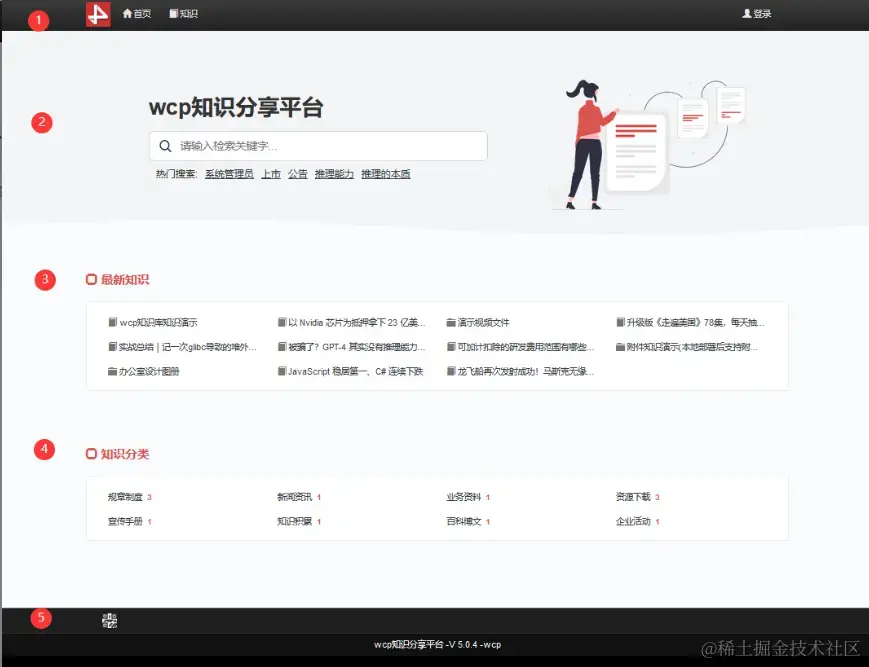 顶端为栏目导航条,免费版有两个栏目,首页和知识(在知识栏目中可以看到知识分类以及分类下的知识列表),最右侧为登录按钮。