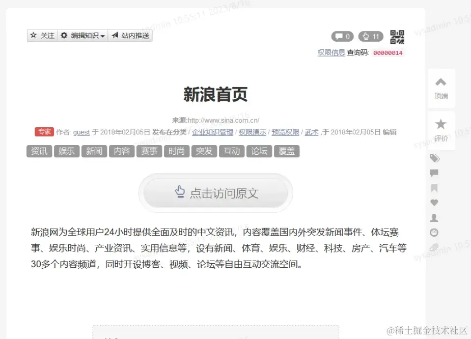资源链接,如下图资源链接在知识库中仅保存资源的链接地址和简单描述。当无編輯权限的用户访问该知识时会直接跳转到该资源对应的原始地址。