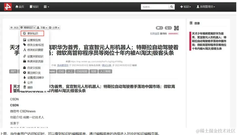 上图,当作者用户访问知识时,可以看到知识的編輯菜单,通过編輯菜单的选择进入对应的知识編輯页面。