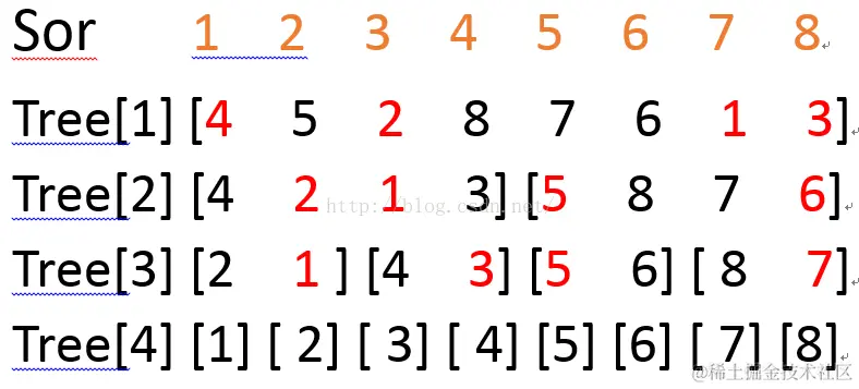 划分后的结果为:tree[1][M]=1 2 3 4 5 6 7(这组数据有点特殊,划分后来就已经是排好序的了)红黑色字体都仍按原未排顺序排列