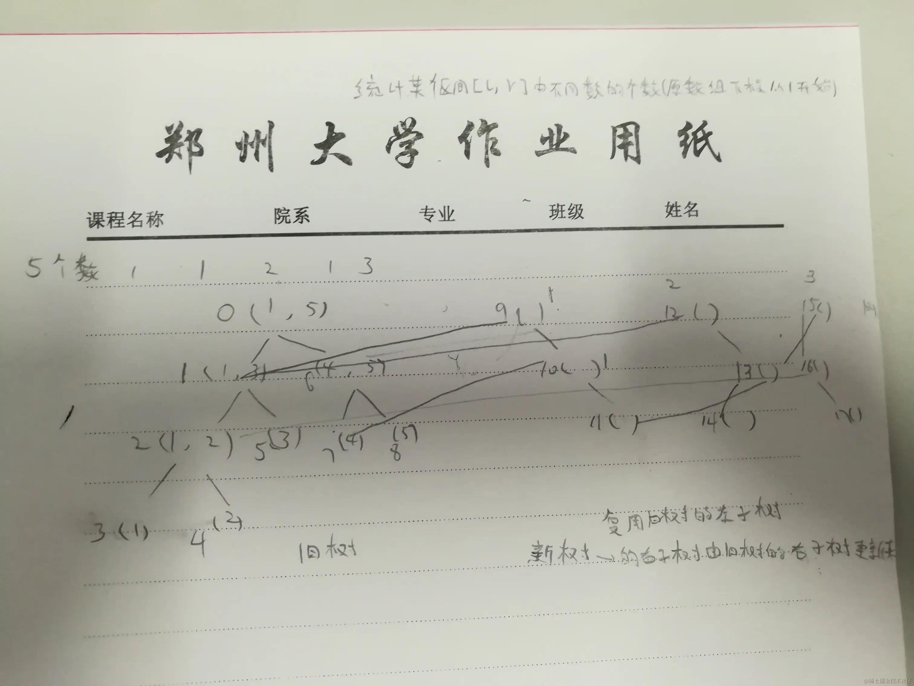 T[i] = update(T[i + 1], i, 1); //每次调用都新建一棵线段树。update返回的是新建树的根节点