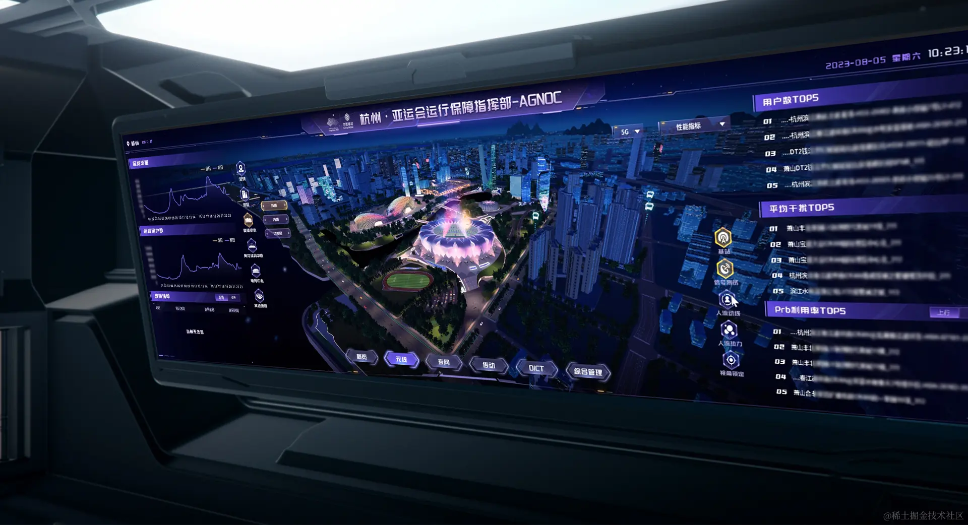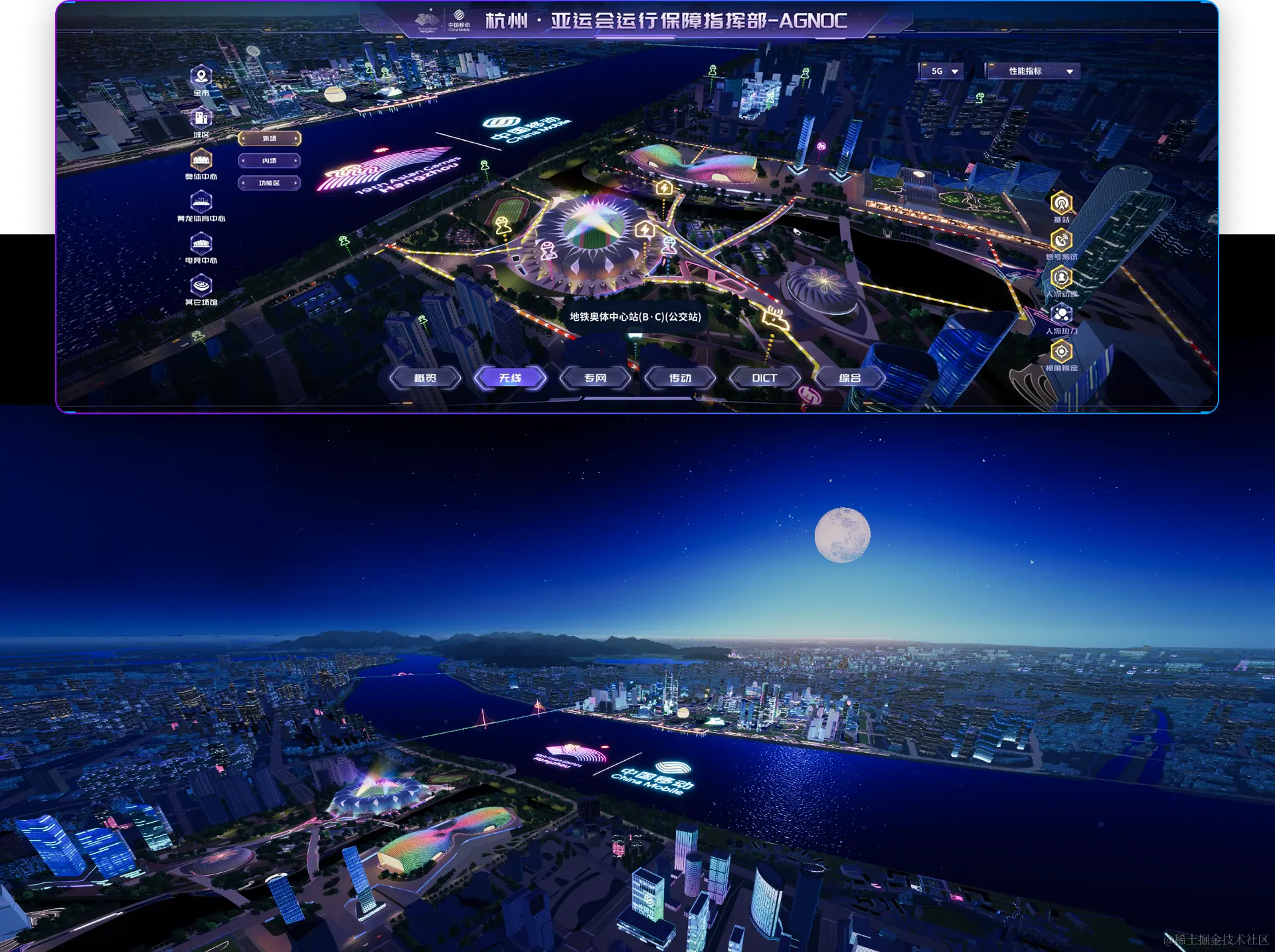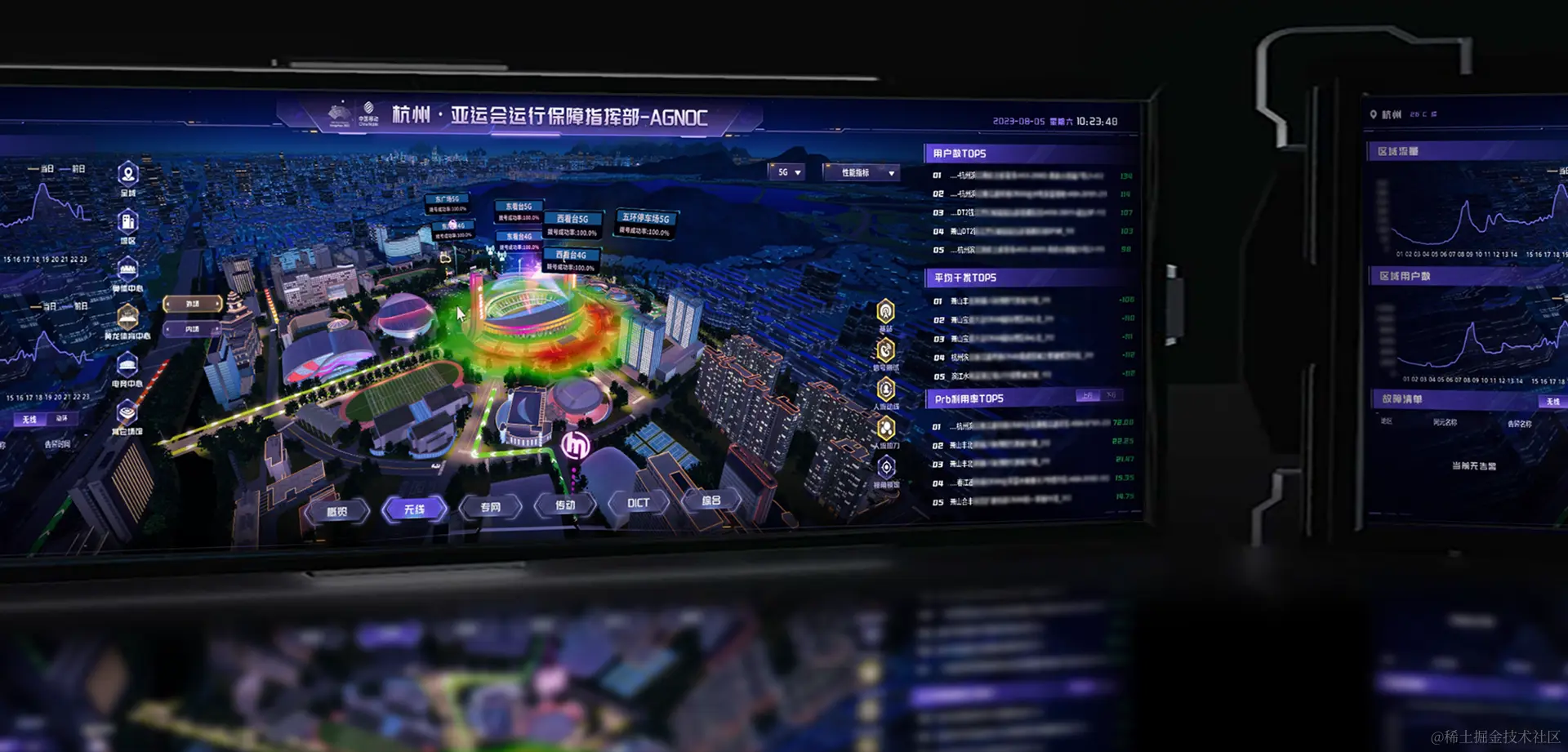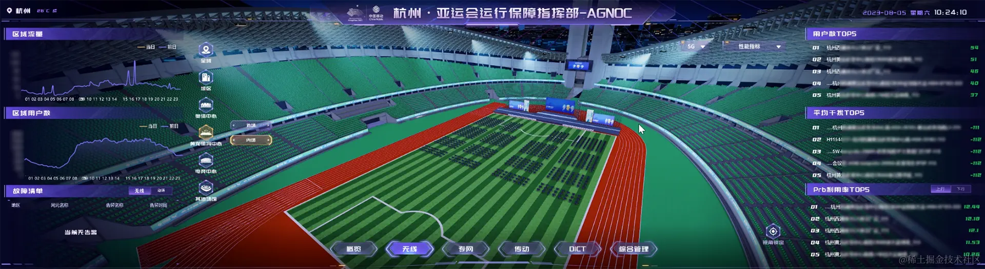 我司参与过冬奥会、春晚的网络运行保障系统的建设,并且在去年也参与了杭州亚运会的其他数字孪生项目,有着丰富的场景素材以及项目经验。了解到这一点,中国移动杭州分公司于今年4月份找到我们,委托我们参与杭州亚运会网络运行保障系统数字孪生部分的开发。