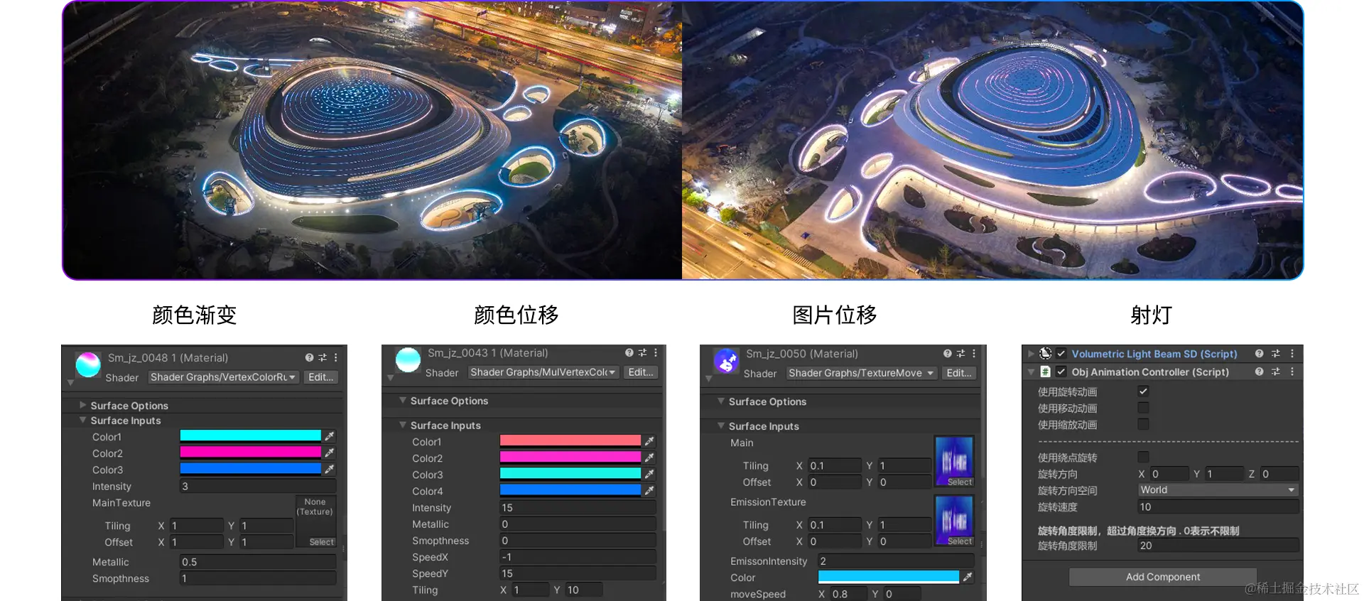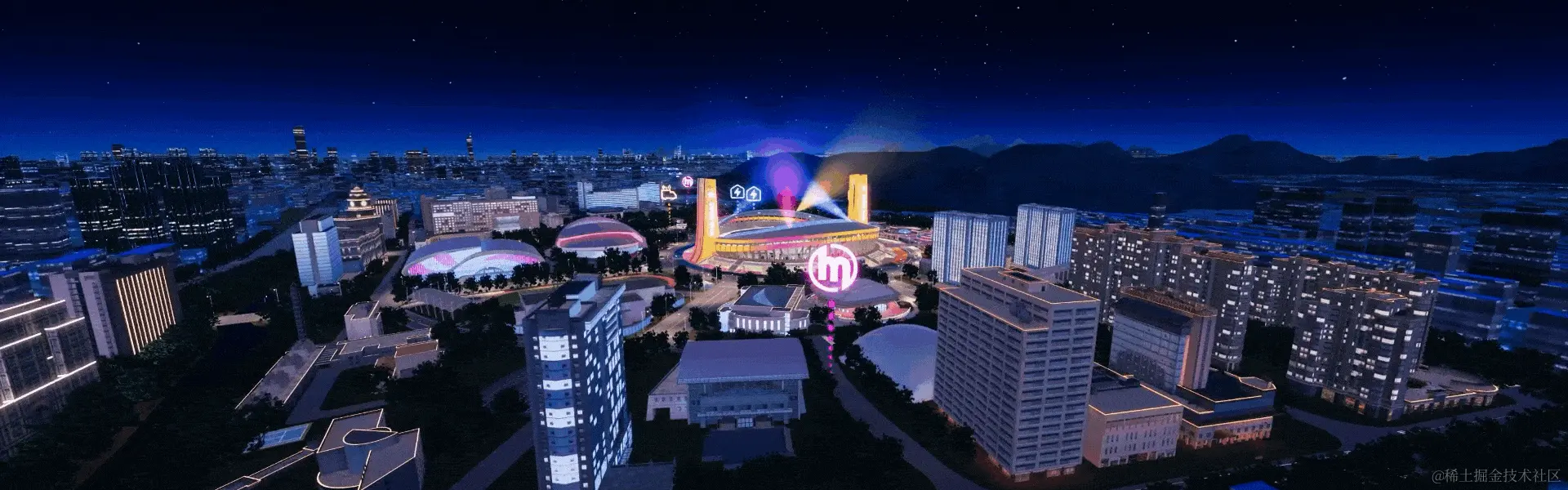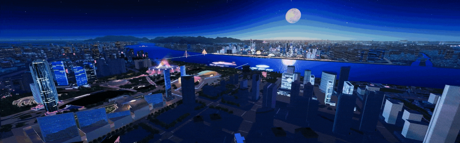 通过手工建模的方式我们对三个重点场馆以及一个通用场馆进行建模,并在unity3d中模拟夜晚的灯光秀来提升场景的氛围感。