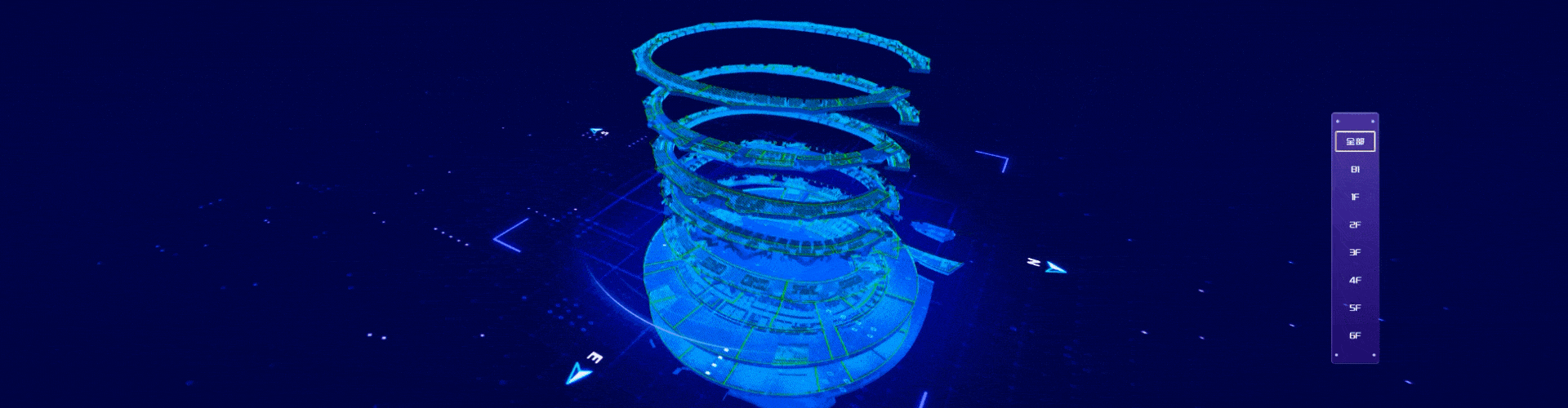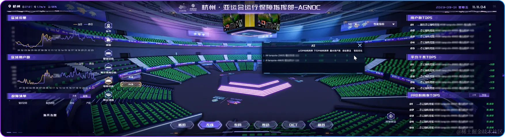 室内场景主要监测坐席区的网络覆盖情况。我们给坐席的模型分组并绑定数据,通过红橙黄绿的颜色在坐席模型上呈现,让各区块的网络质量在三维场景中一目了然,便于使用者尽快决策,尽快部署。正中间的座位区可以根据不同演唱会坐席排列情况,做到可以根据数据动态生成。这样在亚运会后该系统也能继续在日常保障中使用,让系统有了延续性。