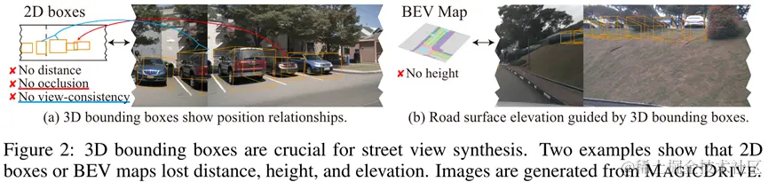 BEVGen[1]将3D几何信息(路面和物体位置)都投影在BEV空间中,这会丢失全部高度信息,既无法控制物体高度/遮挡,也无法体现路面起伏;BEVControl[2]将3D几何信息分别投影在相机视图中,对于没有高度信息的路面地图而言,投影本身就是一个欠定义的问题,而且这种做法丢失了深度信息,同样无法准确控制遮挡。