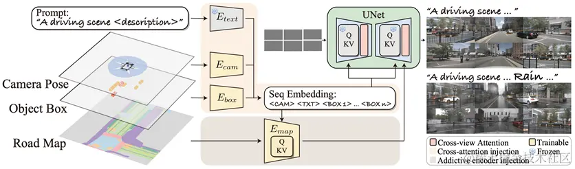 具体来说,对于场景级别的信息(语言描述和相机参数)和物体框信息,由于他们具有可变长的性质,MagicDrive先使用不同的编码器讲输入数据编码成嵌入序列,然后使用交叉注意力模块控制图像生成过程;