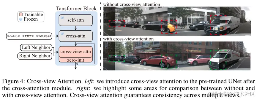 对于自动驾驶场景,不同相机之间重叠程度是有限的,因此并不需要过强的几何约束。相反,在几何条件足够的情况下(即不同视角已经有独立的几何条件信息),只需要让不同视角的生成过程有信息交互,就能够保证前景和背景的一致生成。