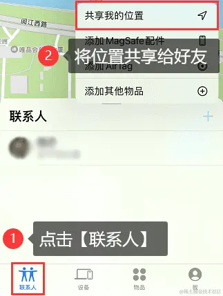 步骤2:在弹出窗口中选择【共享我的位置】,然后选择想要共享位置的联系人,最后将位置发送给对方即可。