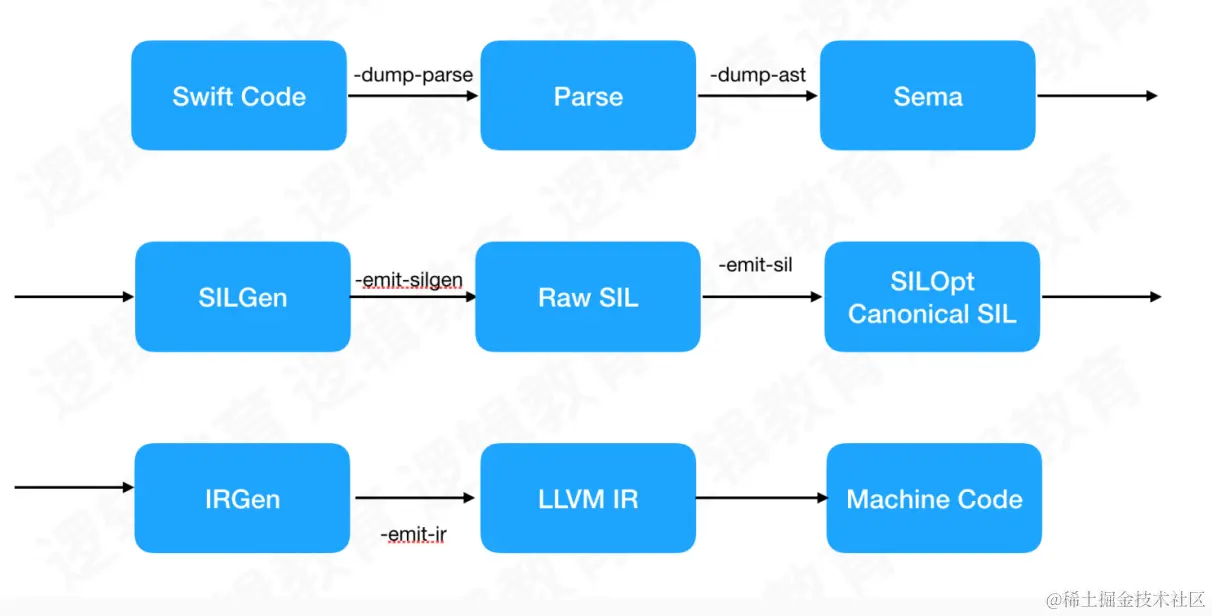 swift的前端编译器为swiftc。一个Swift文件的编译从编译器的角度会经过如下步骤。