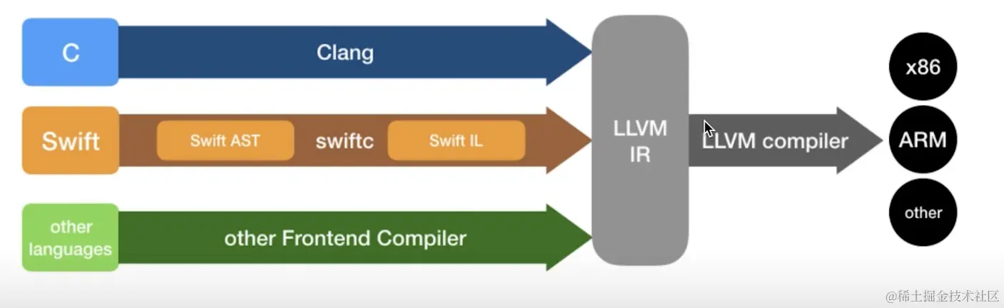 - iOS开发的语言不管是OC还是Swift都是通过LLVM进行编译的。如下图所示: