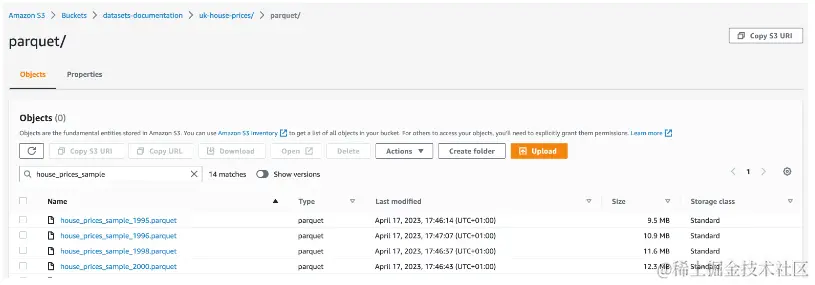 在我们的示例中,我们使用了英国房价数据集。这包含了从1995年到写作时的英格兰和威尔士的房地产价格支付数据。我们在公共s3桶s3://datasets-documentation/uk-house-prices/parquet/中以Parquet格式分发这些数据。