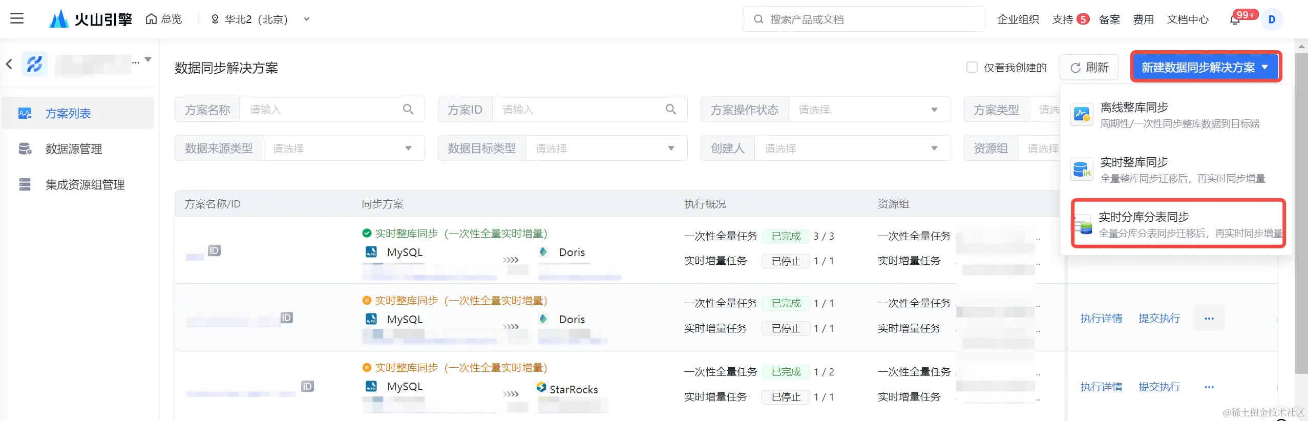 - 实时分库分表方案 :在整库方案基础上, 更进一步支持将schema相同的多个实例的多个数据库的多个分表同步到目标端的一个表中。先离线同步,然后实时同步。适用于分库分表场景。当前支持 MySQL同步到 EMR-Doris、StarRocks、LAS。支持直连同步,也支持中间缓存到后 kafka 后再同步。