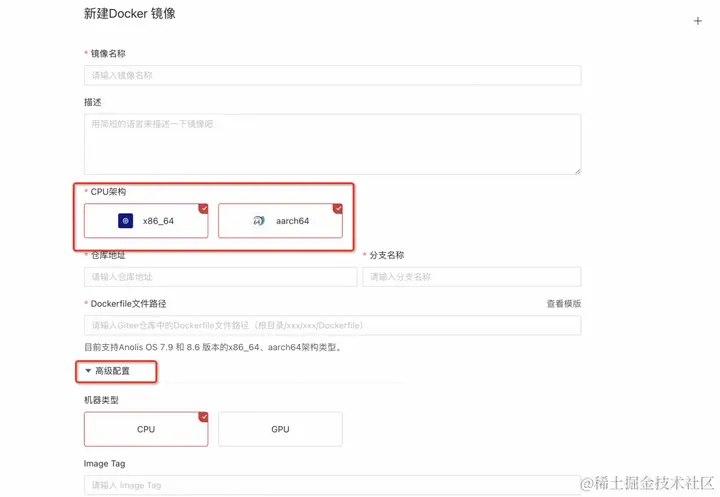 云原生-Docker 镜像创建页面增加镜像架构选择和高级配置项,用户在构建时可以选择镜像架构的类型(支持多选)来构建单架构或多架构镜像,同时在高级配置中用户可选择构建机器类型和自定义镜像 tag。