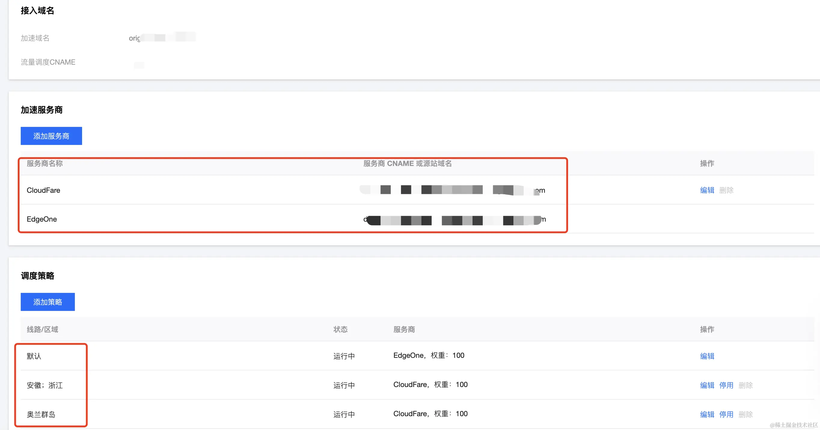 与源站高可用类似,可以将加速域名分配多加速服务上,按地域实现调度。当某个服务商故障时,可修改策略或走默认策略,实现跨云间调度