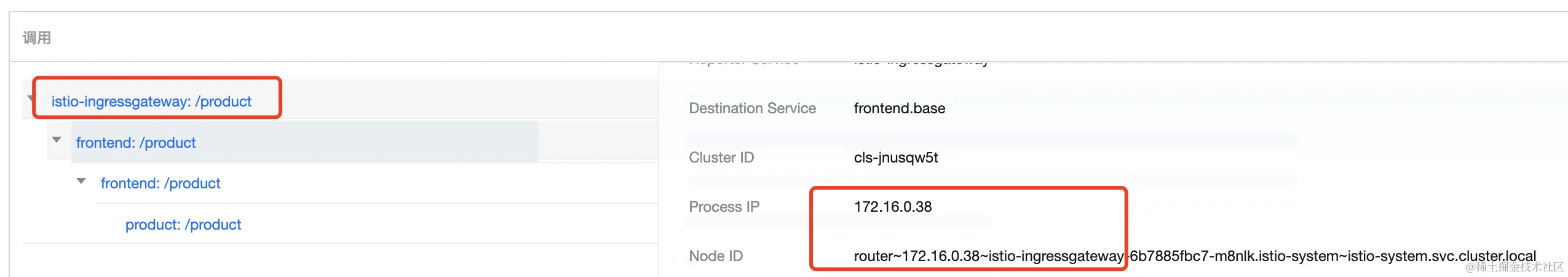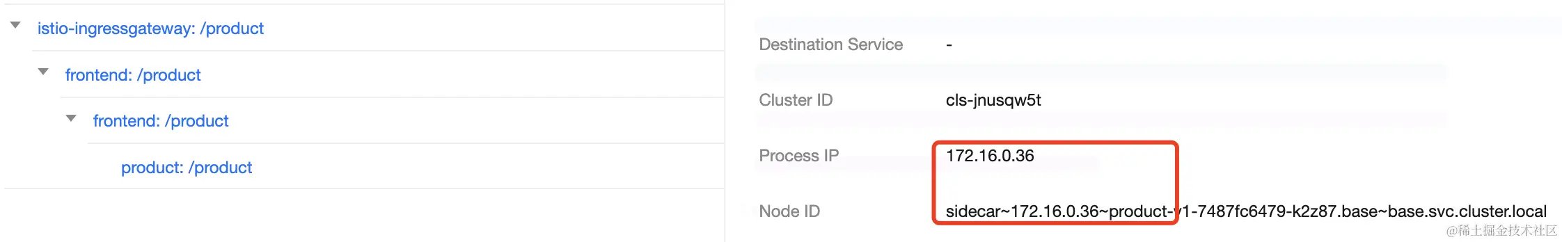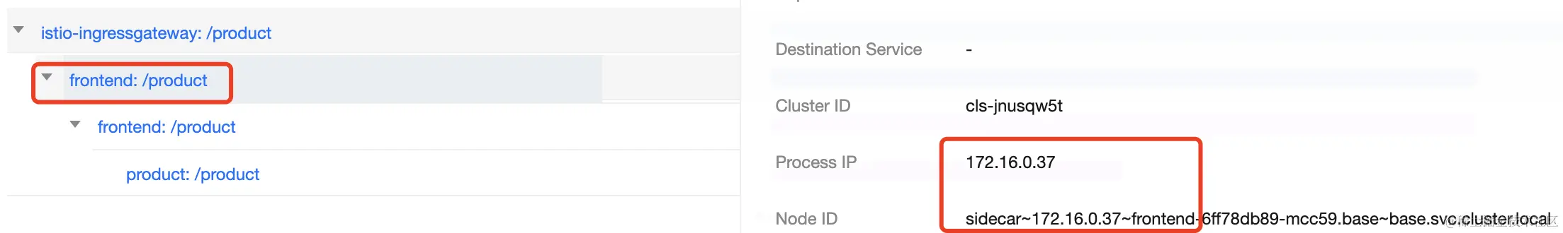 如果流量是从四区的istio gateway进入,那么访问product时,链路会是istio gateway --> frontend --> product,且都在四区,反之亦然。