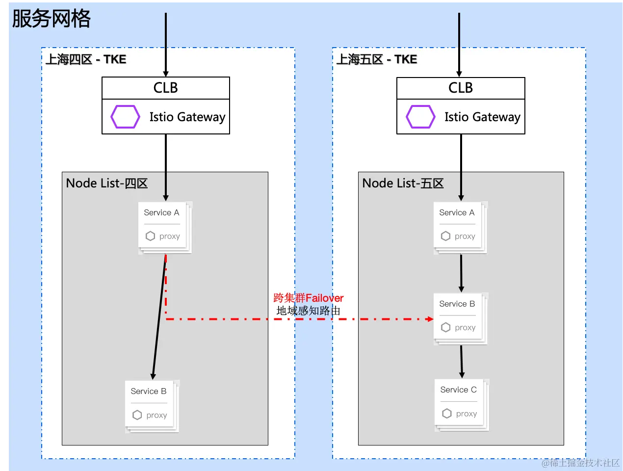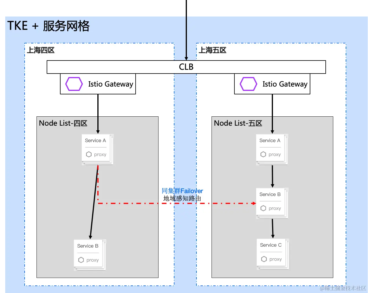 比如一个服务网格+一个TKE集群场景,流量进入四区的istio-gateway后,只会调用四区的Service A,依此类推。