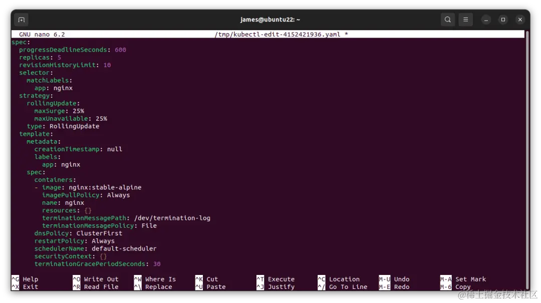 您可以通过运行kubectl edit来更改 Deployment 的属性。这将在默认编辑器中打开 Deployment 的 YAML 清单: