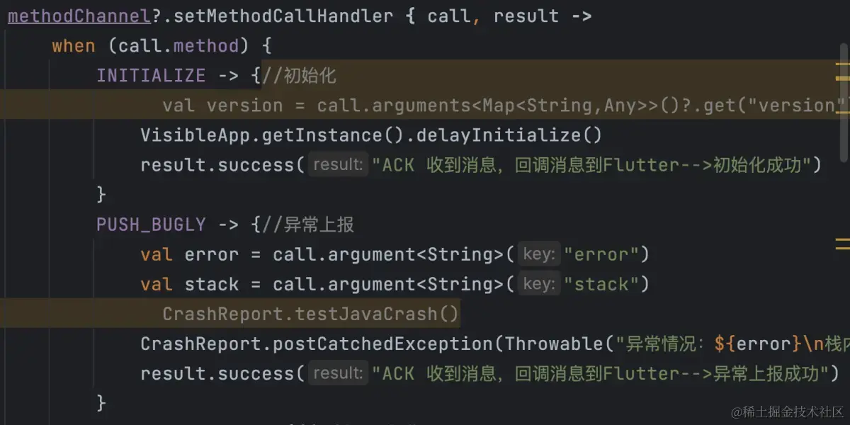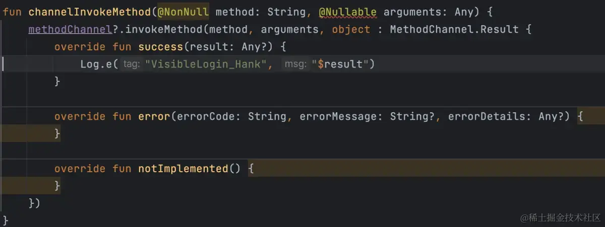 通过call.method判断调用方法。call.argument("error")获取flutter传递数值。调用完毕后,可通过result.success(value)进行回调flutter,其中value为任意类型值。