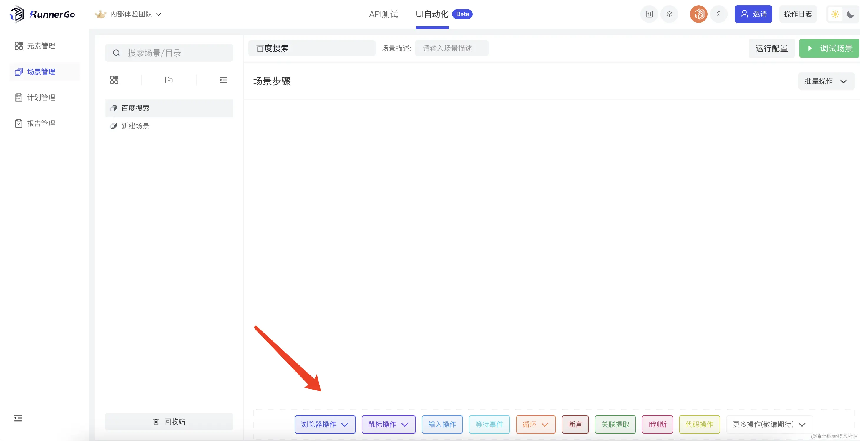 以一条简单的搜索场景为例,本文介绍RunnerGo UI自动化的配置方法。通过百度搜索的场景步骤为:进入百度搜索页面-点击输入框-输入搜索内容-点击百度搜索按钮-关闭页面