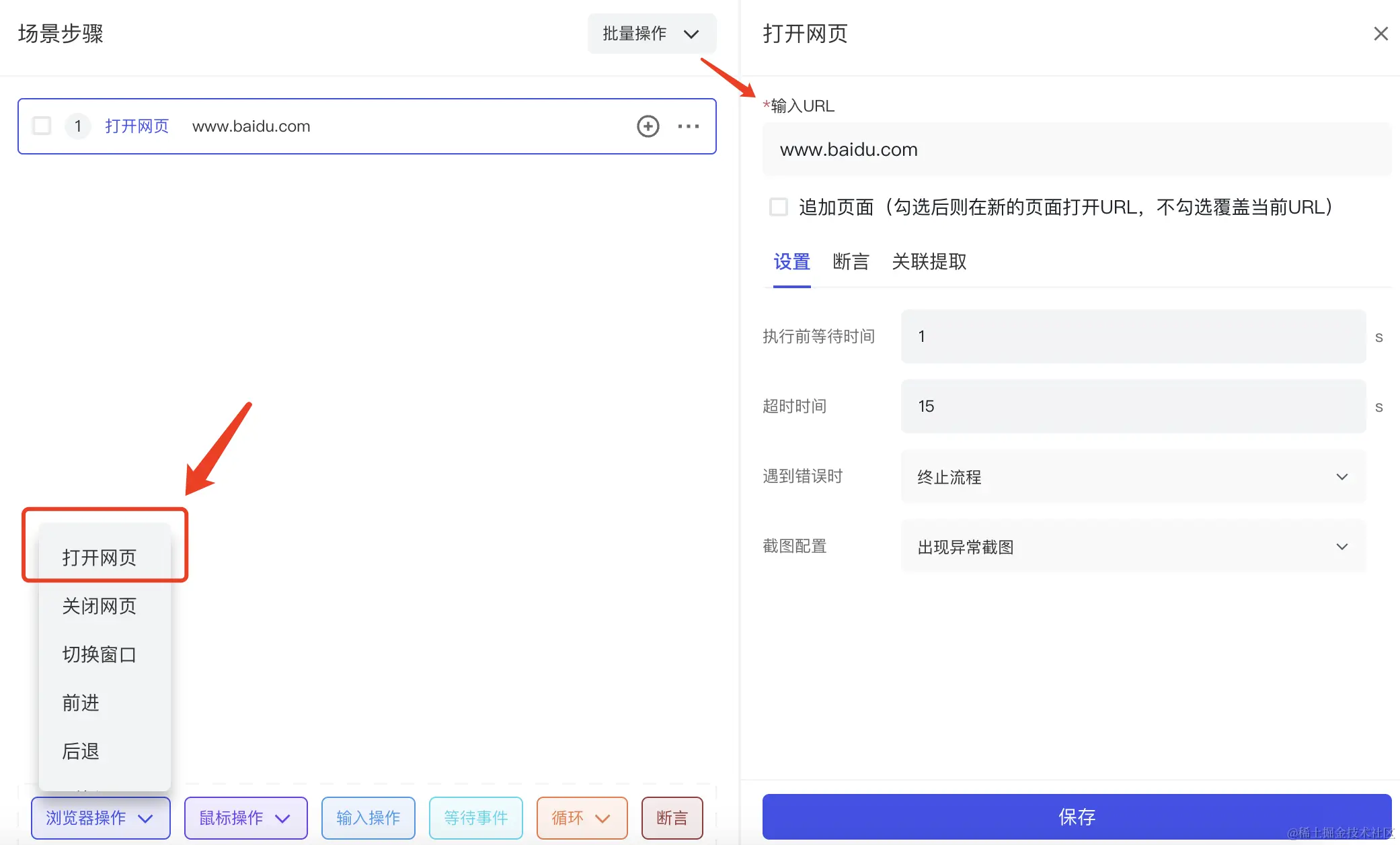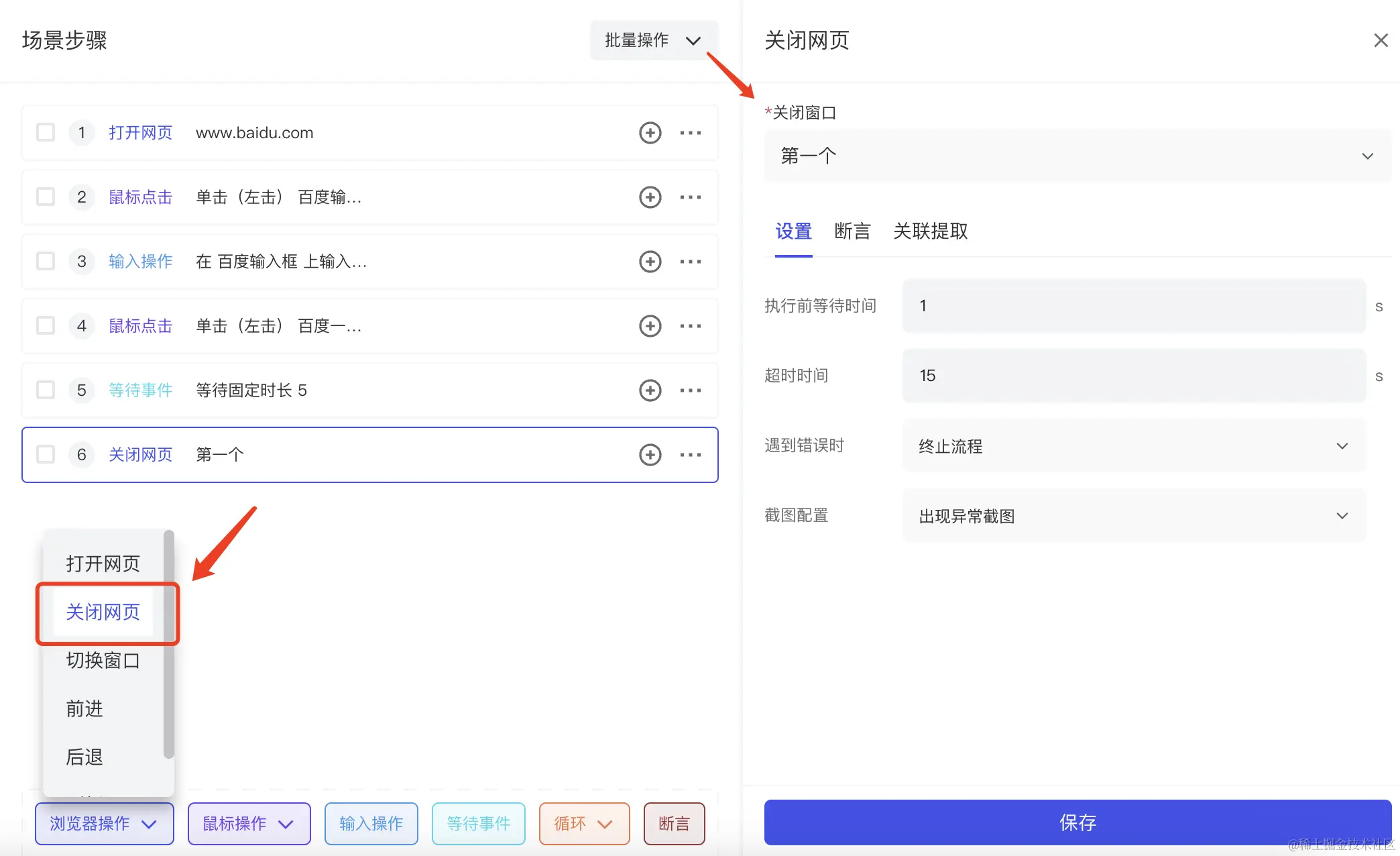 测试完成后自动关闭页面,在浏览器操作中选择关闭网页配置关闭窗口。
