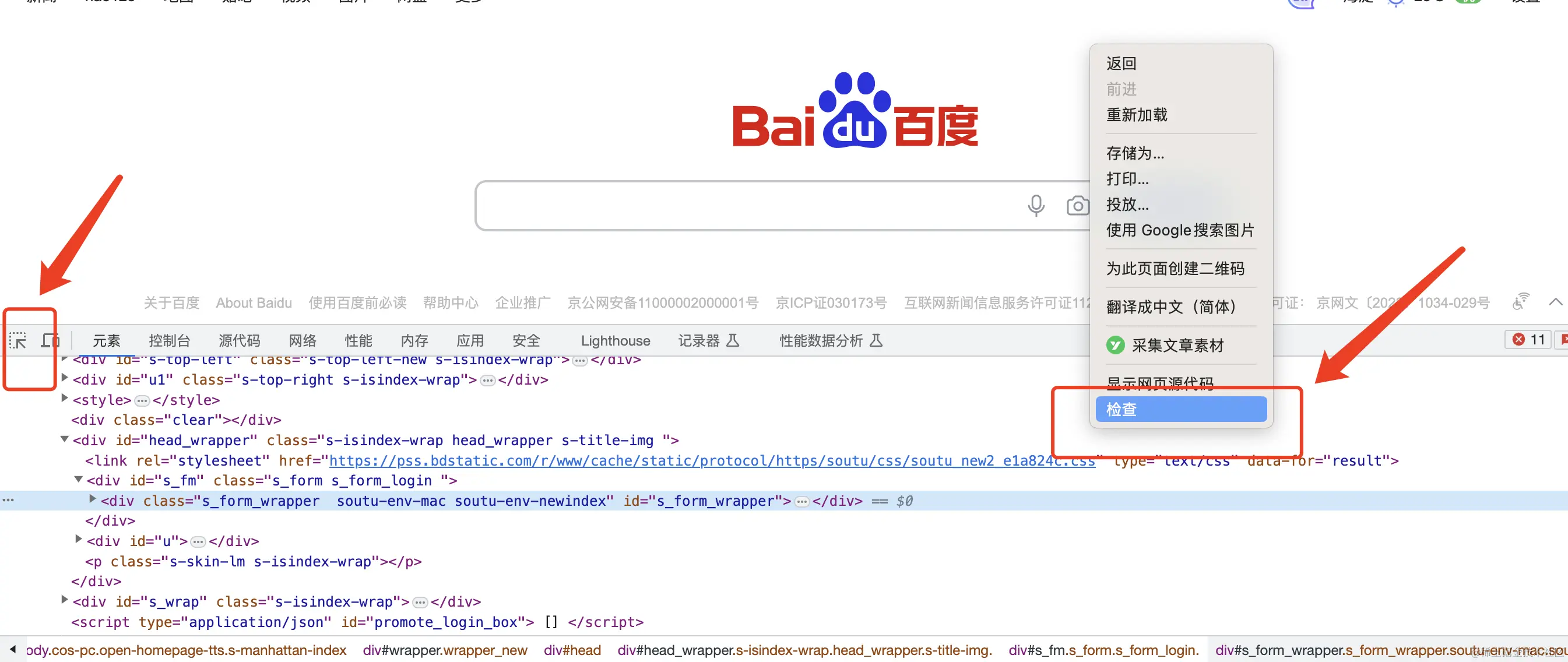 这里我们以一个打开百度搜索的场景,添加了百度输入框和百度一下按钮两个元素,首先需要获取到这两个元素的Xpath,如图,右键点击检查,点击左侧箭头指向按钮。