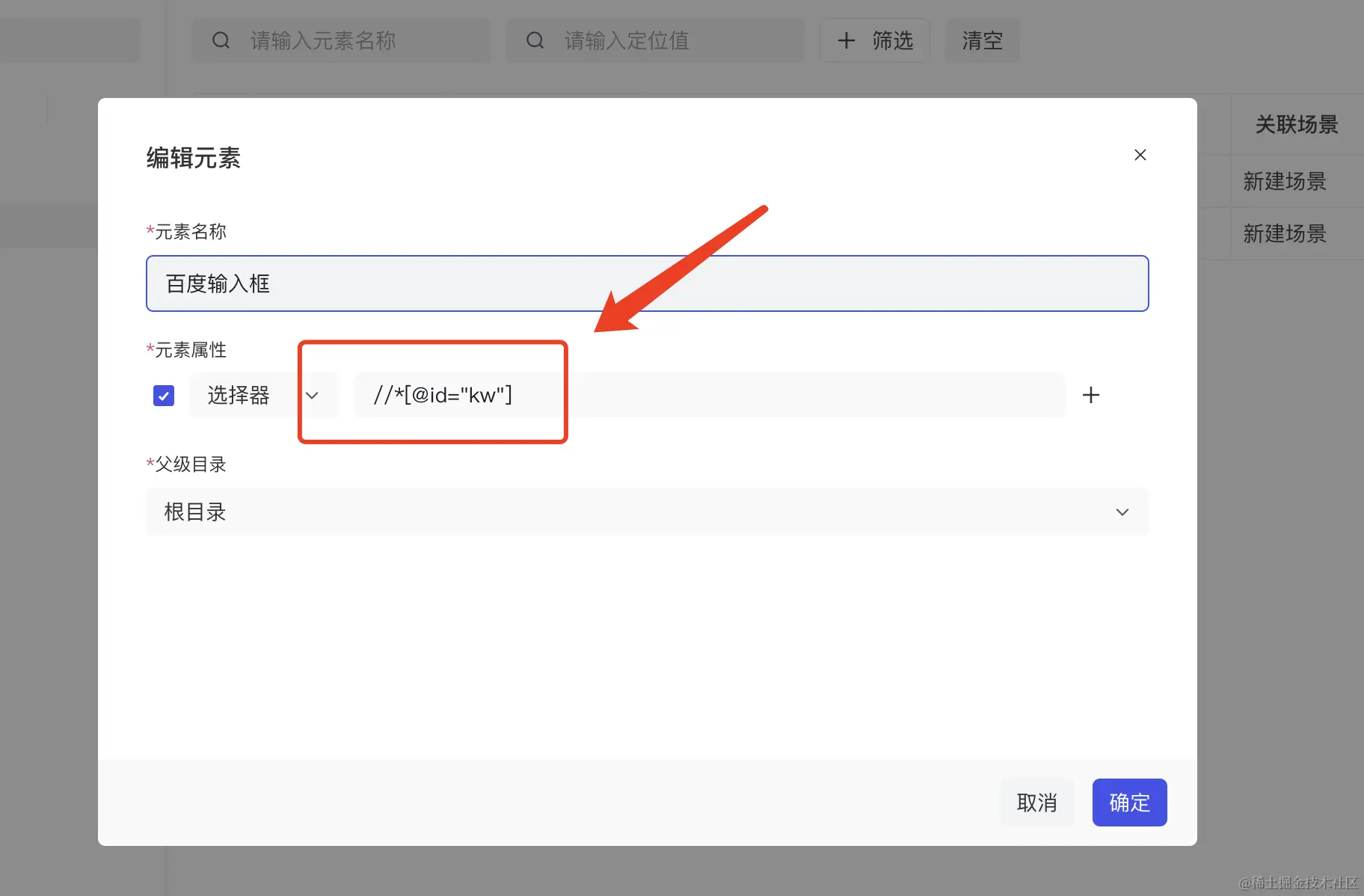 填入RunnerGo元素属性中,点击确定,相同的方法创建百度搜索按钮元素。