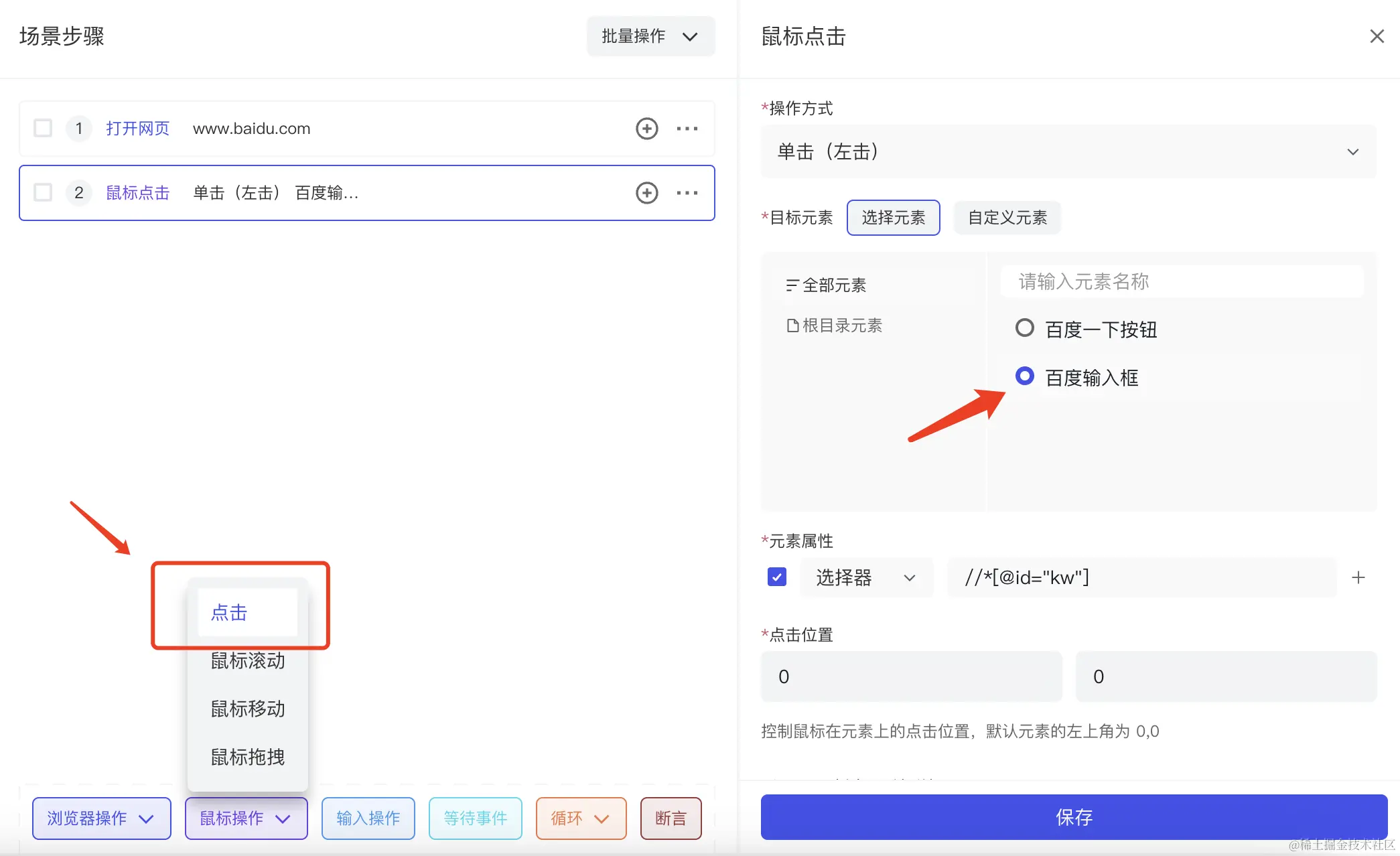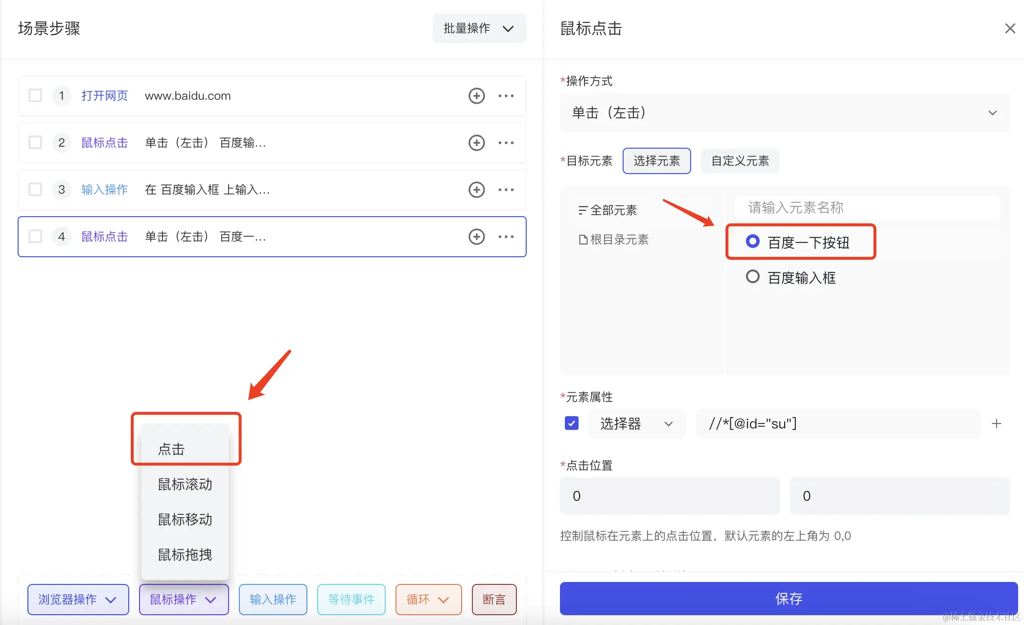 同样新建鼠标点击操作,配置点击百度一下按钮操作。