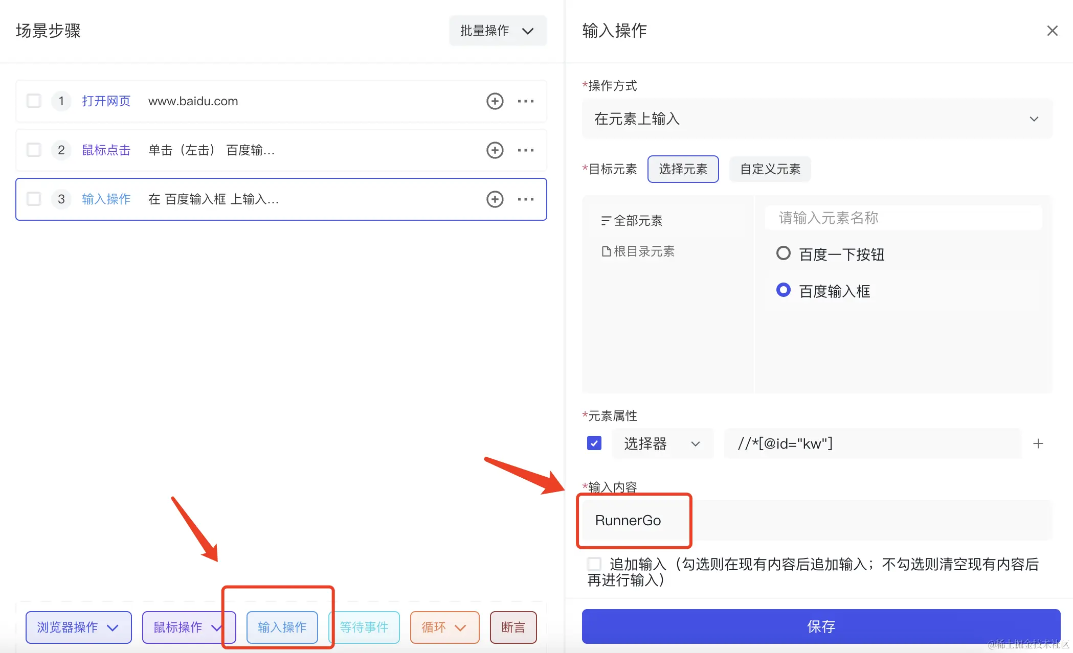 点击输入操作,在下方配置输入内容,我们搜索RunnerGo