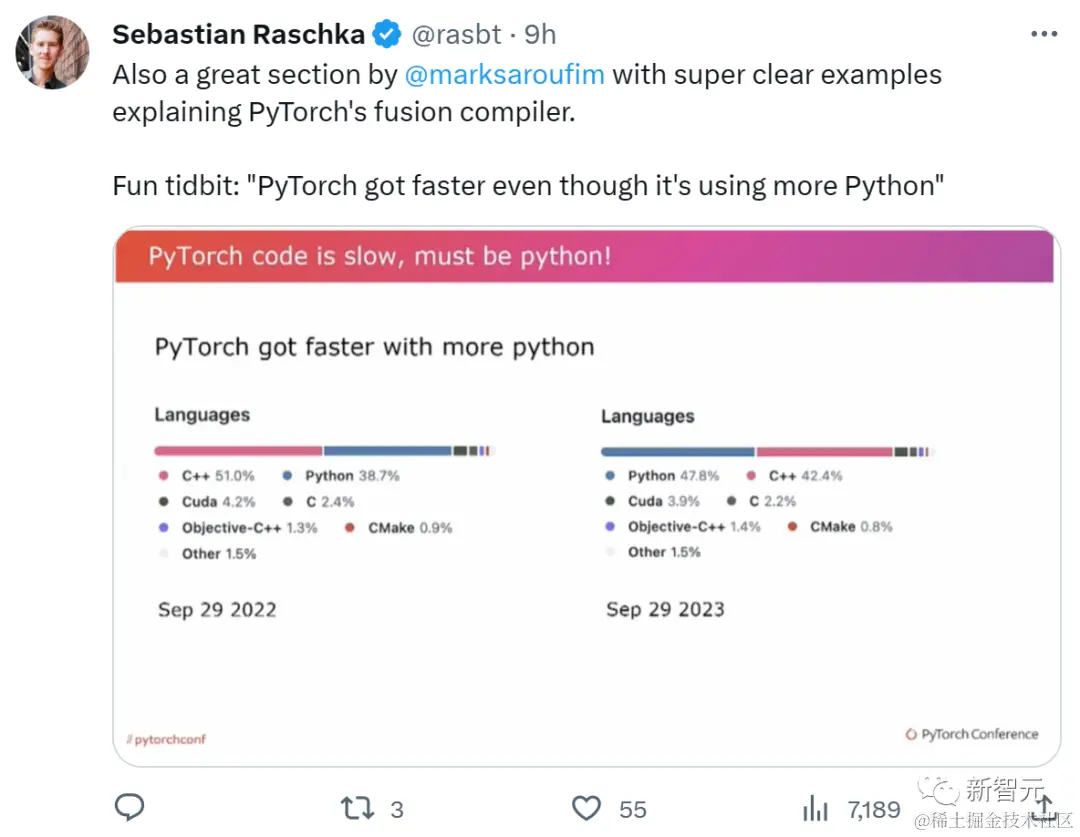 不过,在Pytorch发布会上,Sabastian还发现了一个小花絮,在新版本的Pytorch2.1其Python占比高达47.8%,比去年版本高了9.1%。