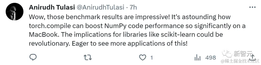 网友Anirudh Tulasi感叹道:哇,这些基准测试结果令人印象深刻!torch.compile在MacBook上如此显著地提高NumPy代码性能,真是令人震惊。这对scikit-learn等库的影响可能是革命性的。渴望看到更多的应用!