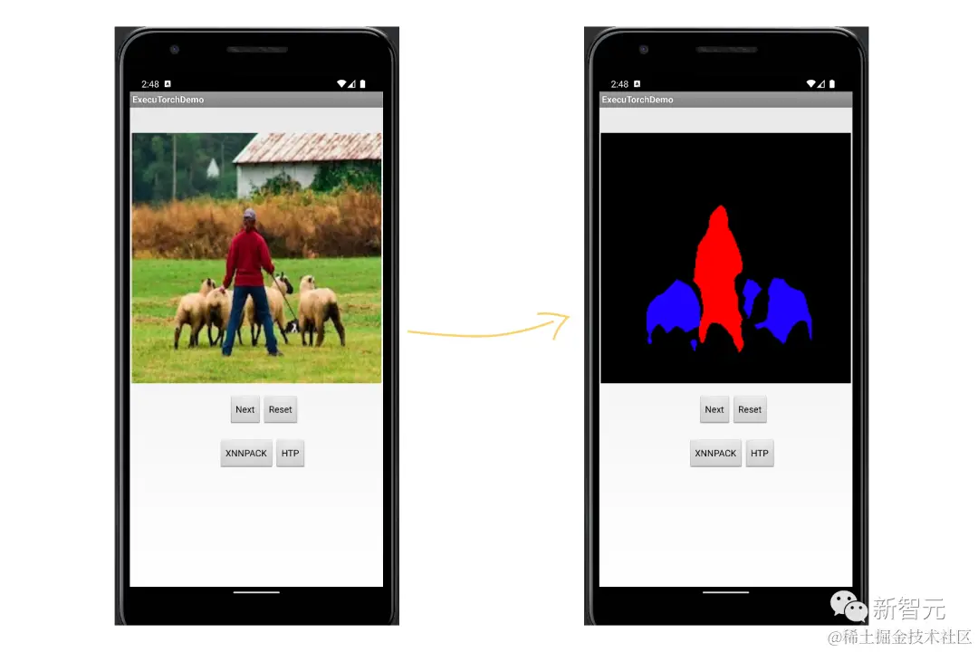 如下图,可以在终端对图像进行语义分割,分割的效果虽然比不上使用GPU推理的结果,但是相信随着终端硬件的发展,其图像处理效果会有进一步的提升。