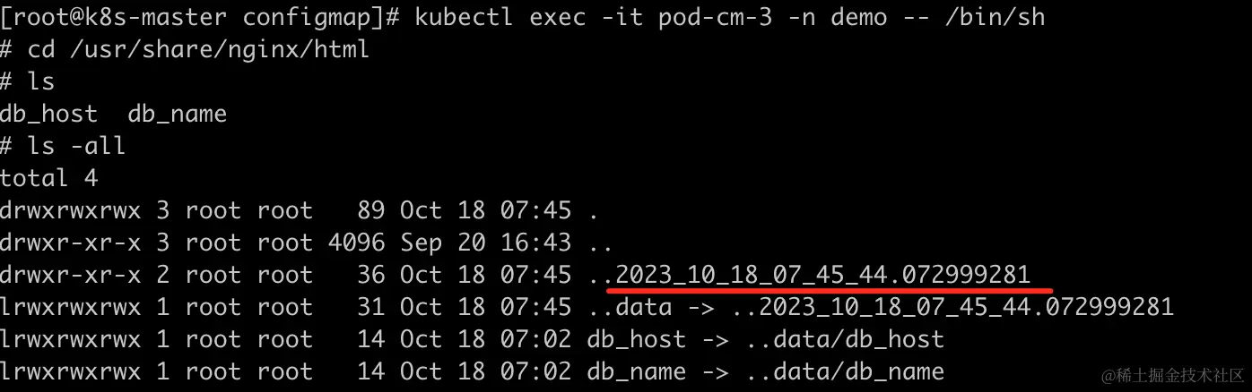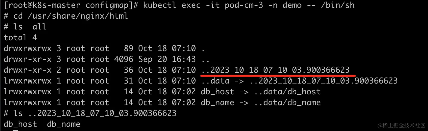 进入到容器的/usr/share/nginx/html目录下,可以看到configMap定义的key-value会出现此目录下,并且会有一个类似时间的文件。进入到文件夹里,可以看到对应的db_host和db_name文件。