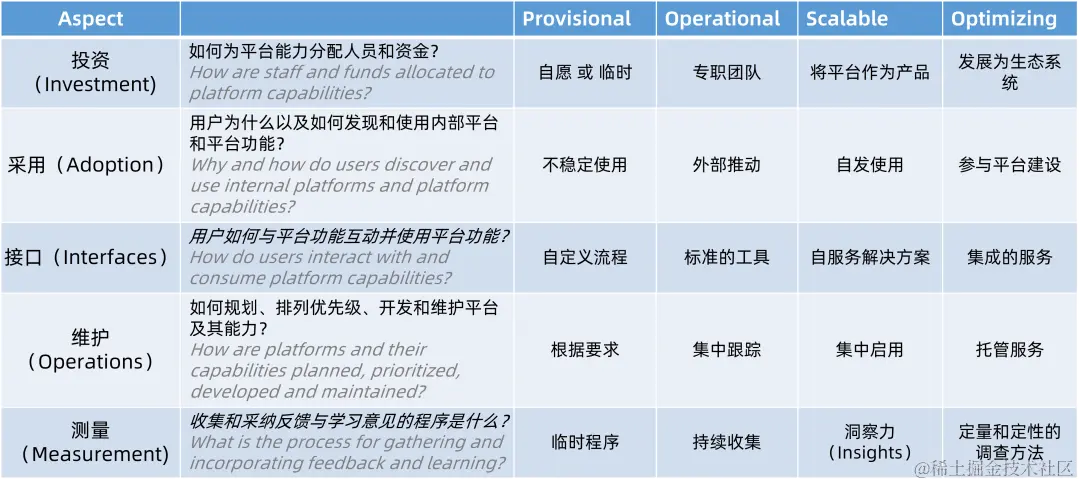 这个模型的目标是为平台工程从业人员、利益相关者以及其他有兴趣的人提供一个工具,帮助他们在平台建设过程中前进。平台的设计和实施不是一门有标准答案的科学,而是根据具体项目、企业内部情况以及特定节点制定的具体需求。