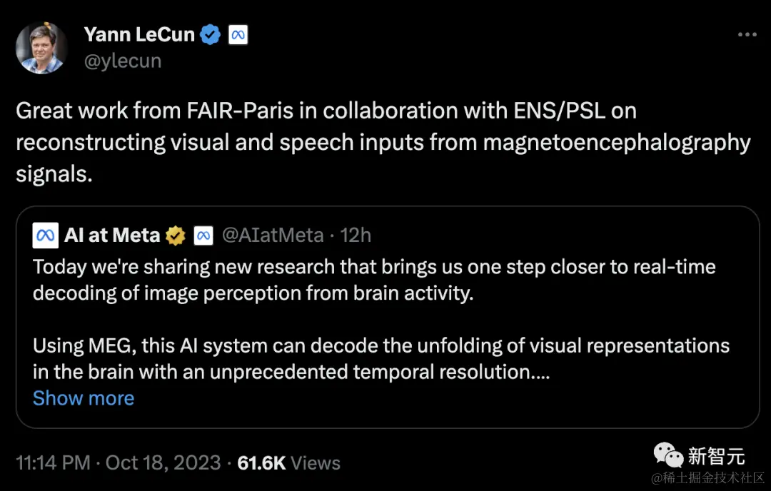 今天 LeCun 转发了 Meta AI 最新的突破:AI 已经能够实时解码大脑活动中的图像感知!