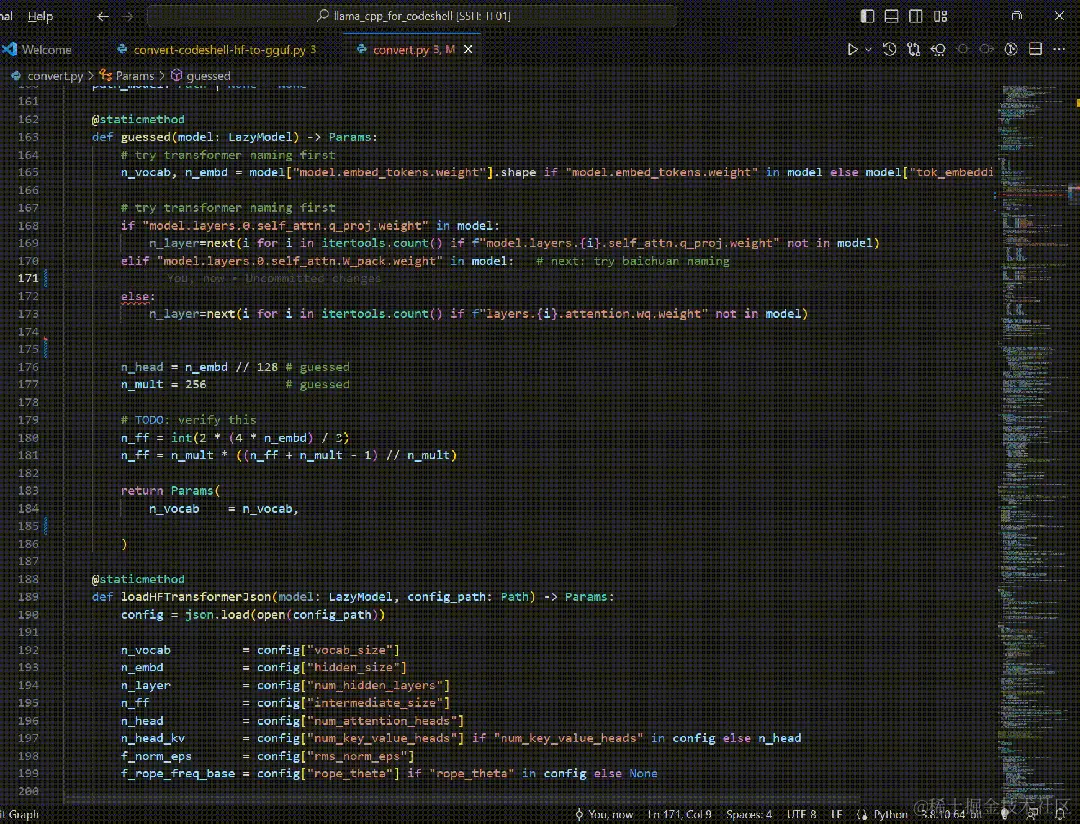 为了进一步降低使用门槛,支持轻量级本地部署,团队针对 CodeShell 独有的架构扩展了 llama.cpp —— 一个纯 C/C++ 实现的 LLaMA 模型高效推理接口,以支持 CodeShell 的模型在各种计算架构中的格式转化、推理运行以及量化部署。