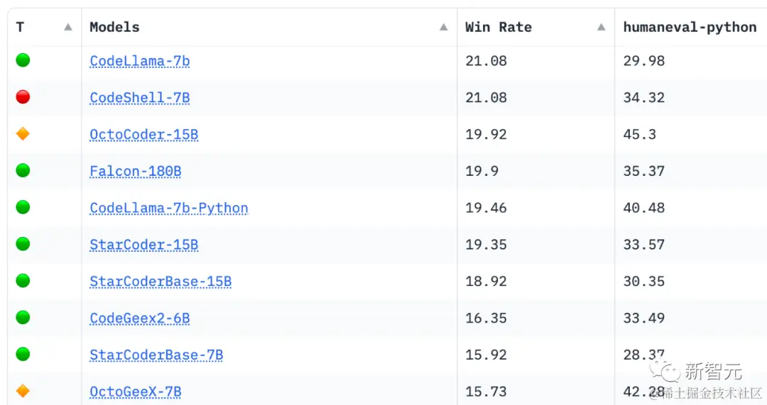 CodeShell 在 Hggingface 权威的代码大模型榜单中的表现也极其亮眼!在这份榜单中,各种经过特定优化的代码基座和微调模型,在 HumanEval 评分上可以超越 CodeLLama,但是体现综合能力的综合胜率(Win Rate)与 CodeLlama 却依然有很大差距。
