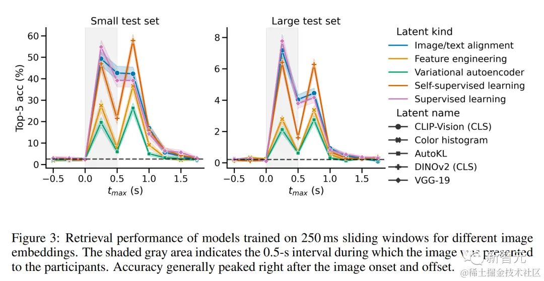 在图像呈现之前,所有模型都获得了基准水平的表现;在图像 0~250ms 的窗口中可以观察到第一个明显的峰值,随后在图像偏移之后出现第二个峰值,然后迅速回落到 0 到 250 毫秒的窗口中,所有模型都符合这个规律。