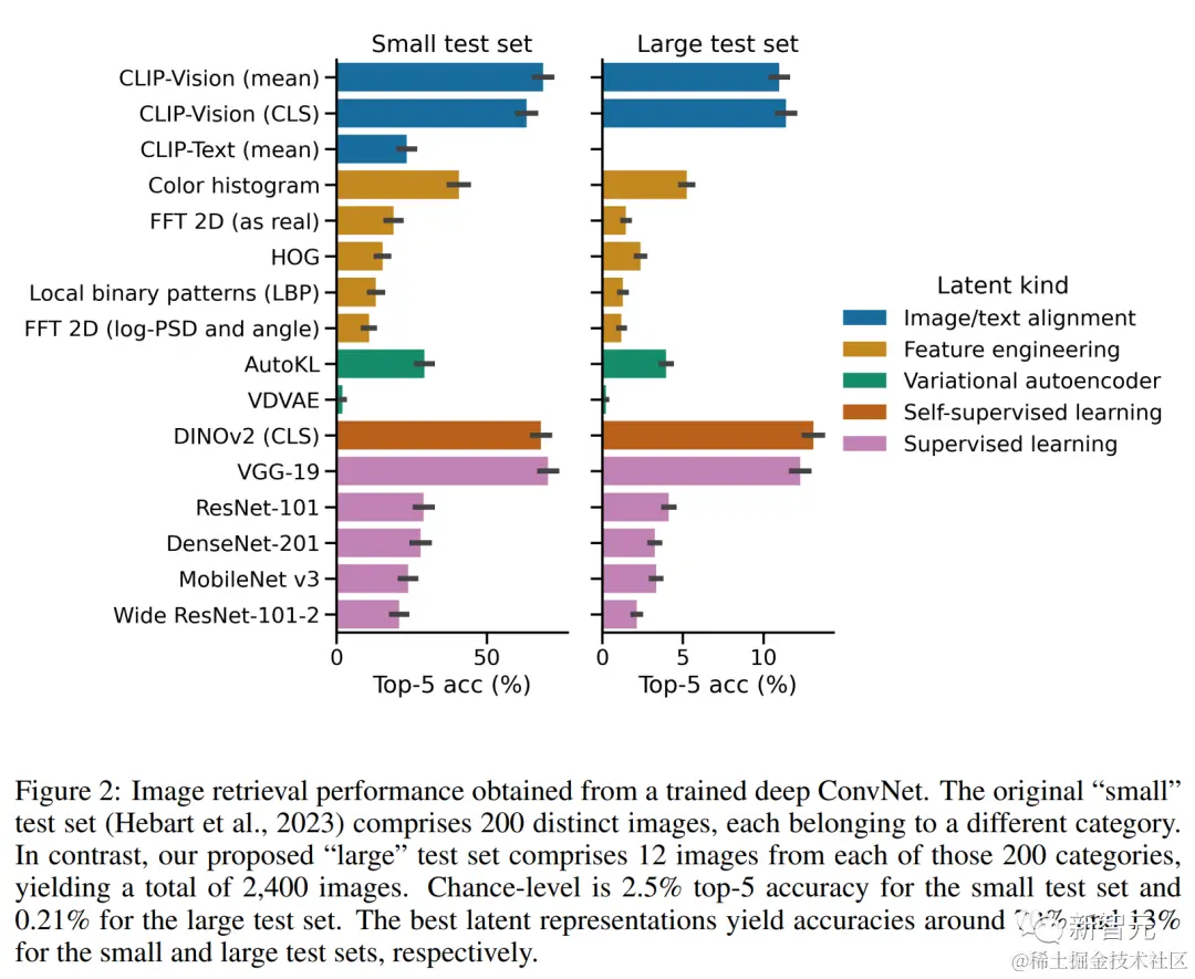 多种图像嵌入类型都展现出良好的检索性能,其中 VGG-19(监督学习)、CLIP-Vision(文本 / 图像对齐)和 DINOv2(自监督学习)的前五准确率分别为:70.33 ± 2.80%、68.66 ± 2.84%、68.00 ± 2.86%(计算了平均图像度量的标准误差)。