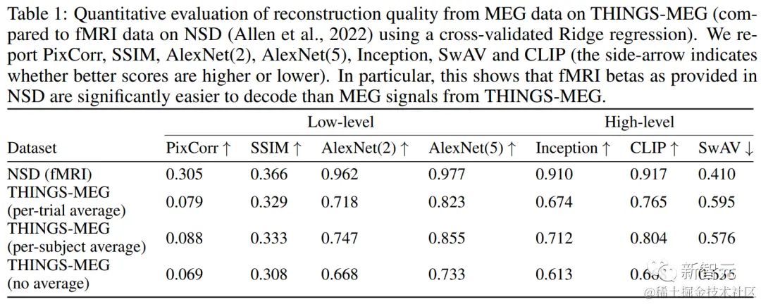 作者为了评估方法的有效性,使用了检索指标 relative median rank,top-5 accuracy,生成指标 PixCorr、SSIM、SwAV。同时,为了对 MEG 解码性能进行公平评估,作者利用了数据集中的重复图像演示,在评估指标之前对预测值取平均值。