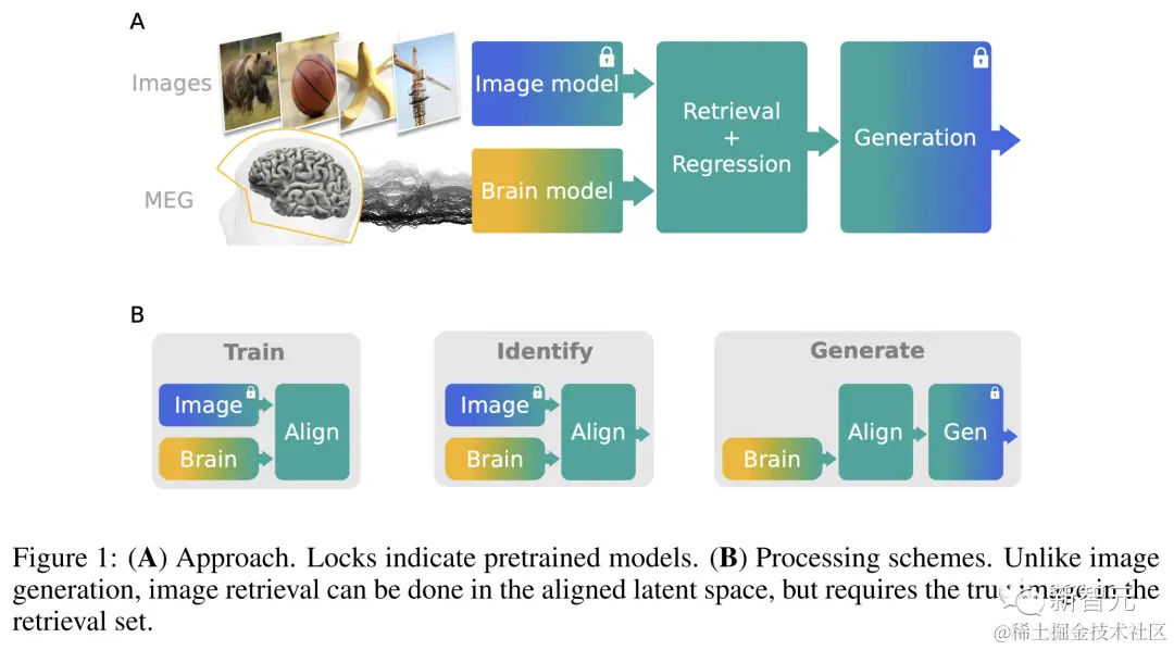 图像编码器在大脑之外独立构建一组丰富的图像表示。然后,大脑编码器学习将 MEG 信号与这些构建出来的图像进行嵌入对齐。
