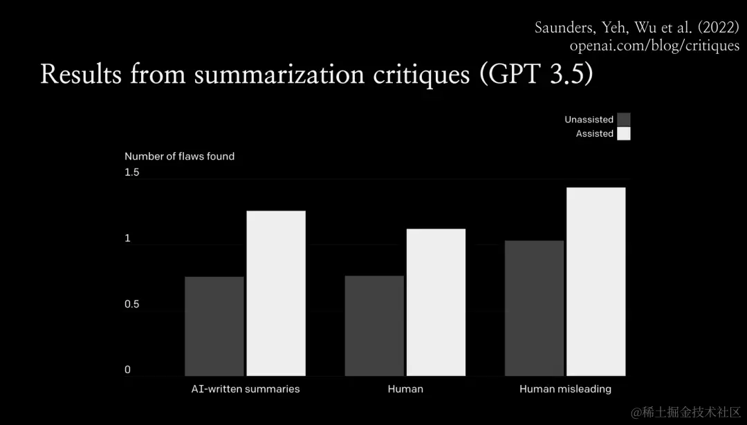实验结果表明,人类在有协助的情况下发现的缺陷比无协助的情况下多出约 50%。 事实上,通过可扩展监督,有协助的人确实在经过篡改的答案中发现了更多缺陷。