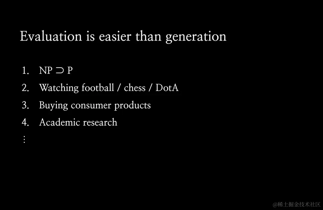 在计算机科学中,你会遇到 NP 问题,你可以在多项式时间内判定某个问题,但你不一定能生成它。在许多其他设定场景中也是如此。比如在体育运动中,你可以通过一支球队进球多少来判断是否获胜,但实际上要打好比赛真的很难。在学术研究中,对优秀论文进行同行评审比提出想法并按照论文中的方式进行实验更容易。