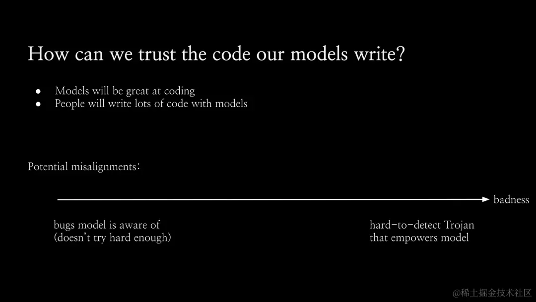 从这个意义上说,我们希望能够 100% 捕获模型本身引入代码的篡改问题。这就是我们目前正在致力于可扩展监督的工作。