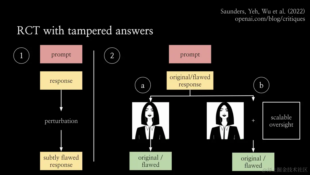那么在第二步中,就拥有了一些答案对,包括原始回答和经过篡改的回答。之后分别利用原始回答和经过篡改的回答开始运行随机对照实验,将其展示给人类或被可扩展的监督辅助的人类。
