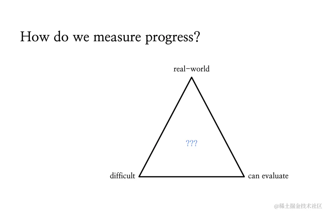 此外,我们没有标准答案。如果你想衡量在现实任务上的提升,我们将面对既困难又无法评估的任务。所以这看起来是一个根本性的矛盾,事实上,我们至少可以局部性地衡量提升。