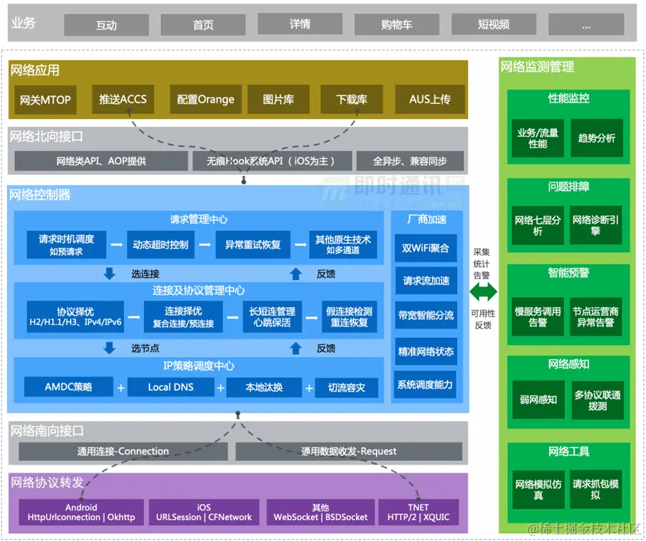 **微信 Mars:**STN 负责请求任务管理/IP 排序/网络策略等能力优化请求体验,SDT 为网络诊断模块,一定程度上与 AWCN 中网络控制器、网络性能管理两块部分承担角色相近。